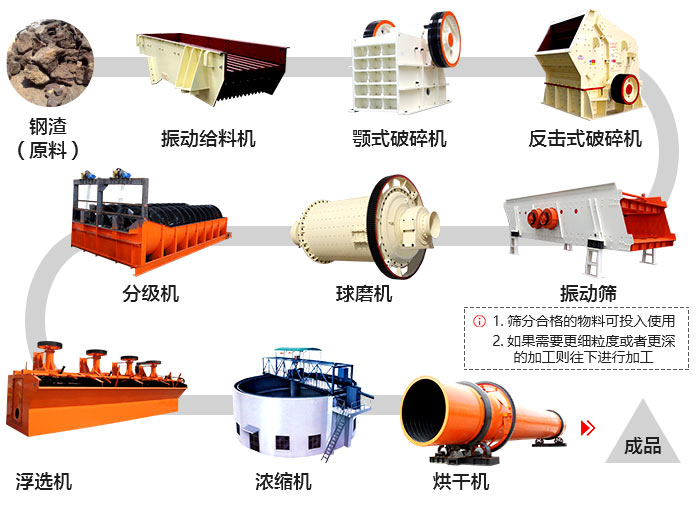 在振動給料機的作用下,將堆積的鋼渣均勻、連續的送到顎式破碎機進行粗碎加工,粗碎后的鋼渣通過振動篩,合格的進入反擊式破碎機或圓錐破碎機進行中、細碎加工,不合格的返回上層繼續破碎,相同的經反擊式破碎機或圓錐破碎機破碎后的鋼渣合格的通過輸送機輸出,即為成品,不合格的返回繼續破碎加工。